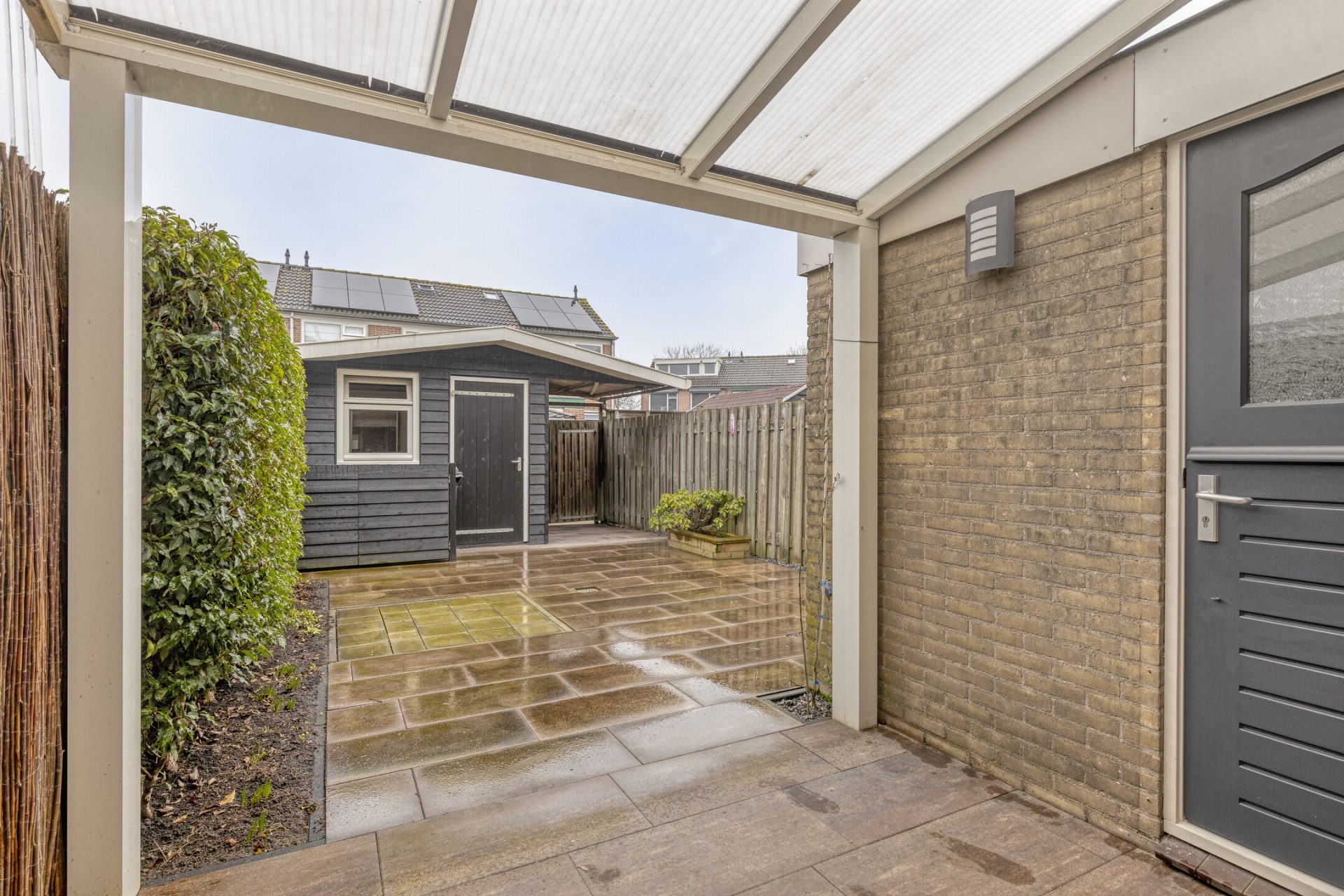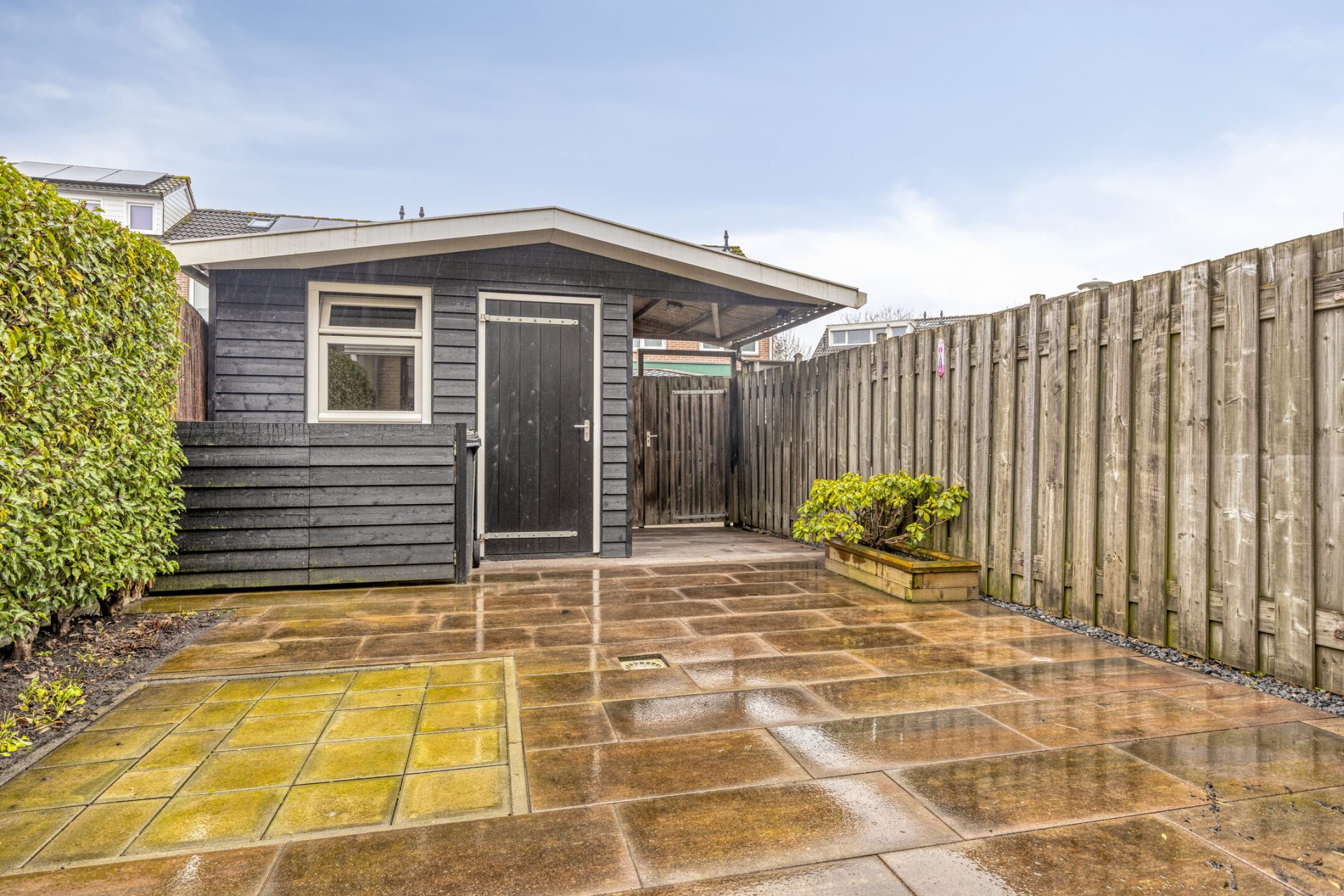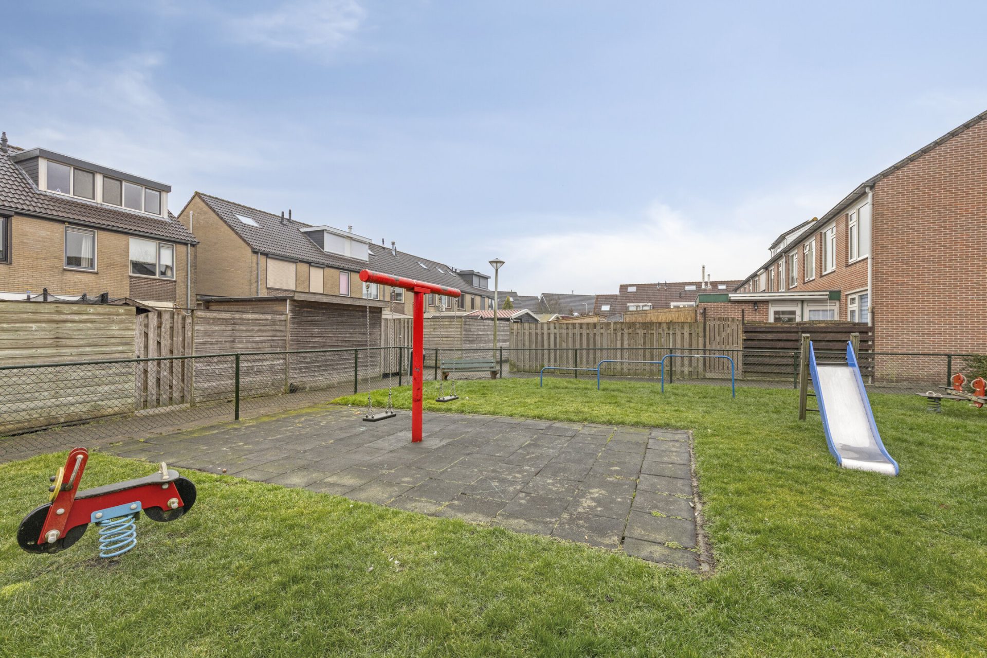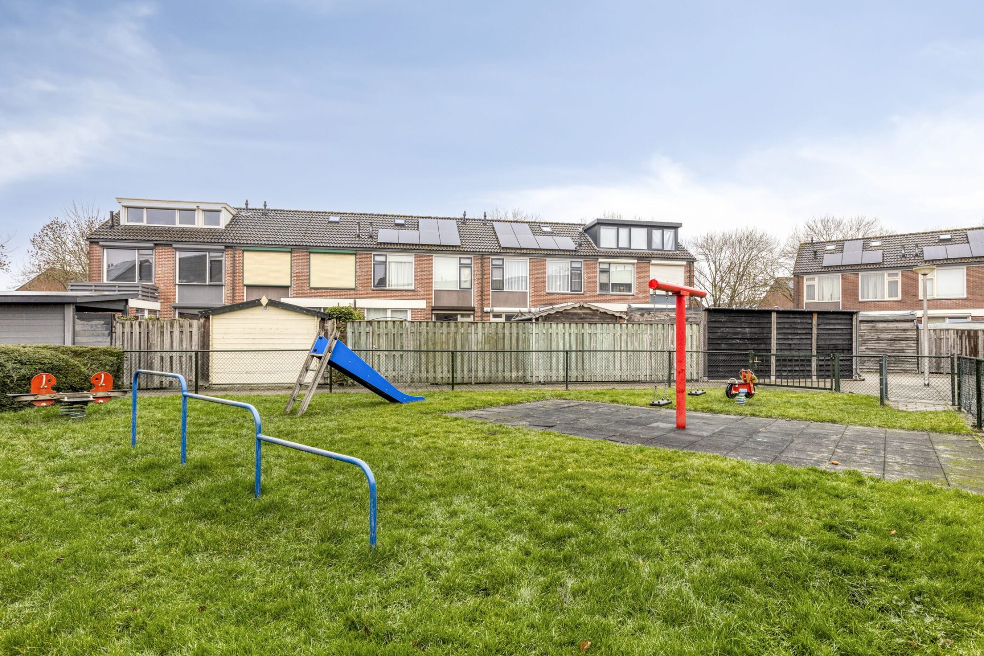 Vanuit de woonkamer loop je door naar de bijkeuken, die toegang biedt tot de ruime achtertuin met overkapping en een schuur. De tuin grenst direct aan een speeltuin aan de achterzijde van de woning, wat deze woning bijzonder geschikt maakt voor gezinnen met kinderen.