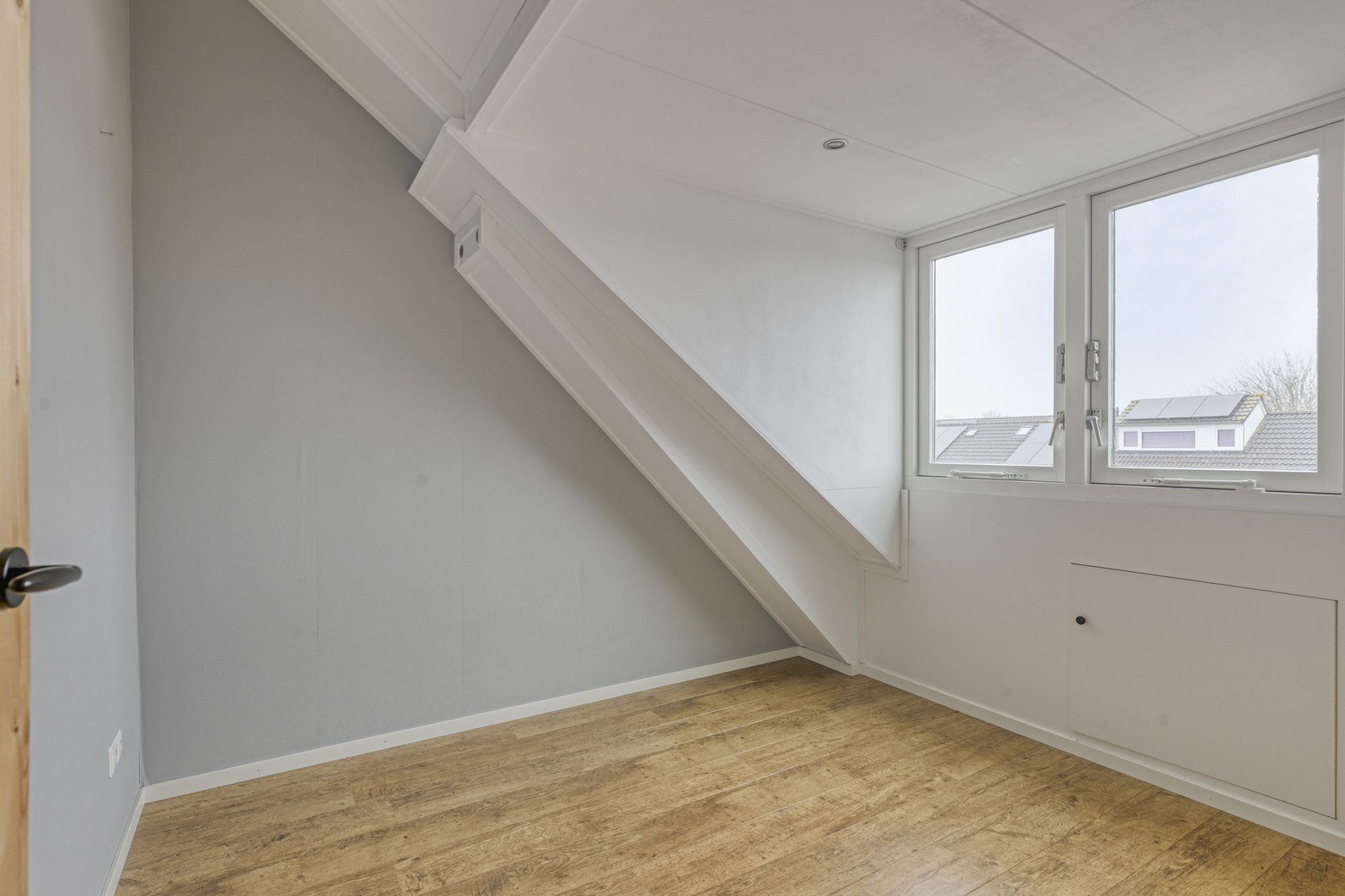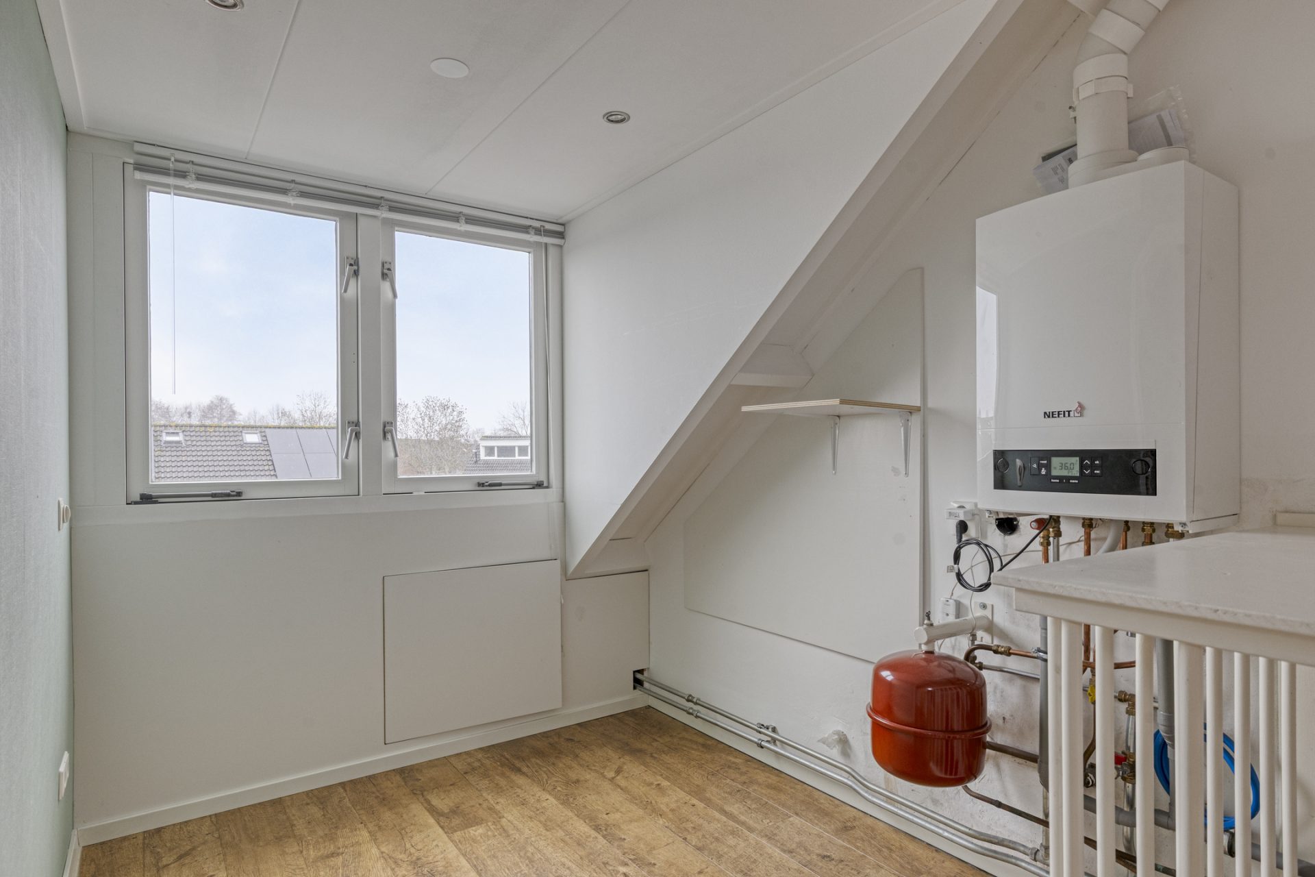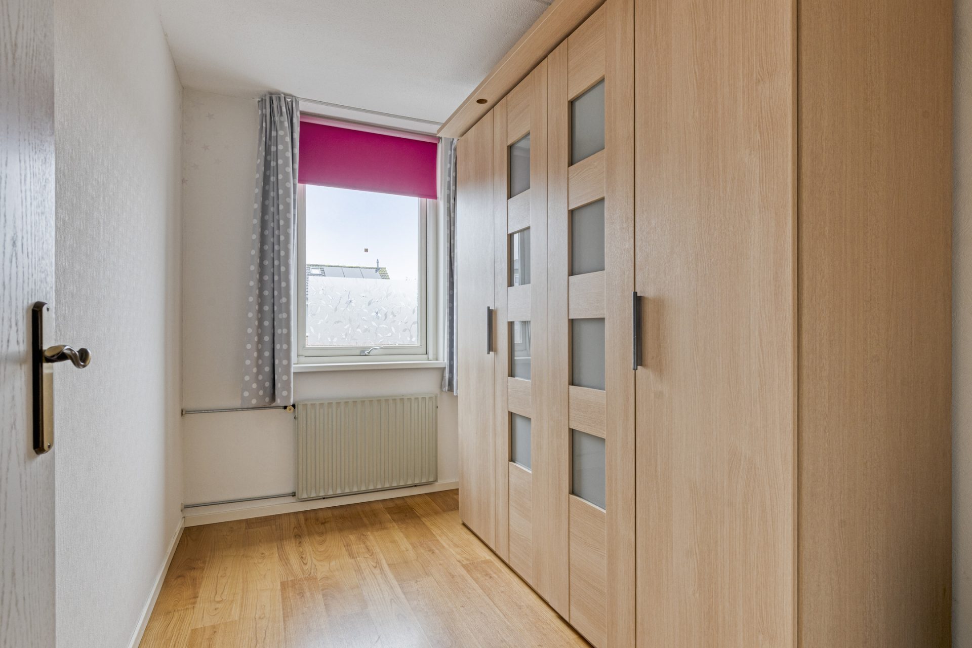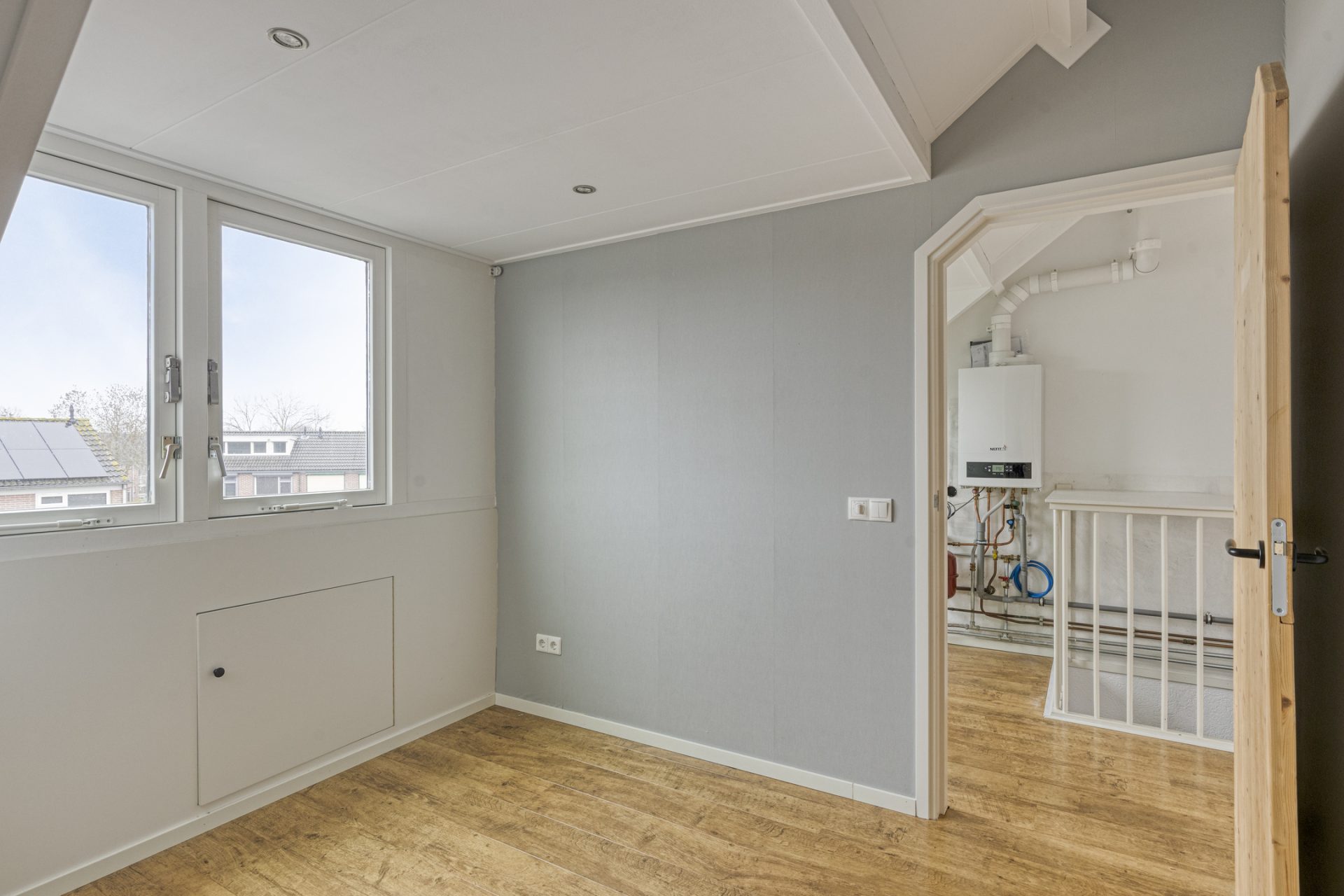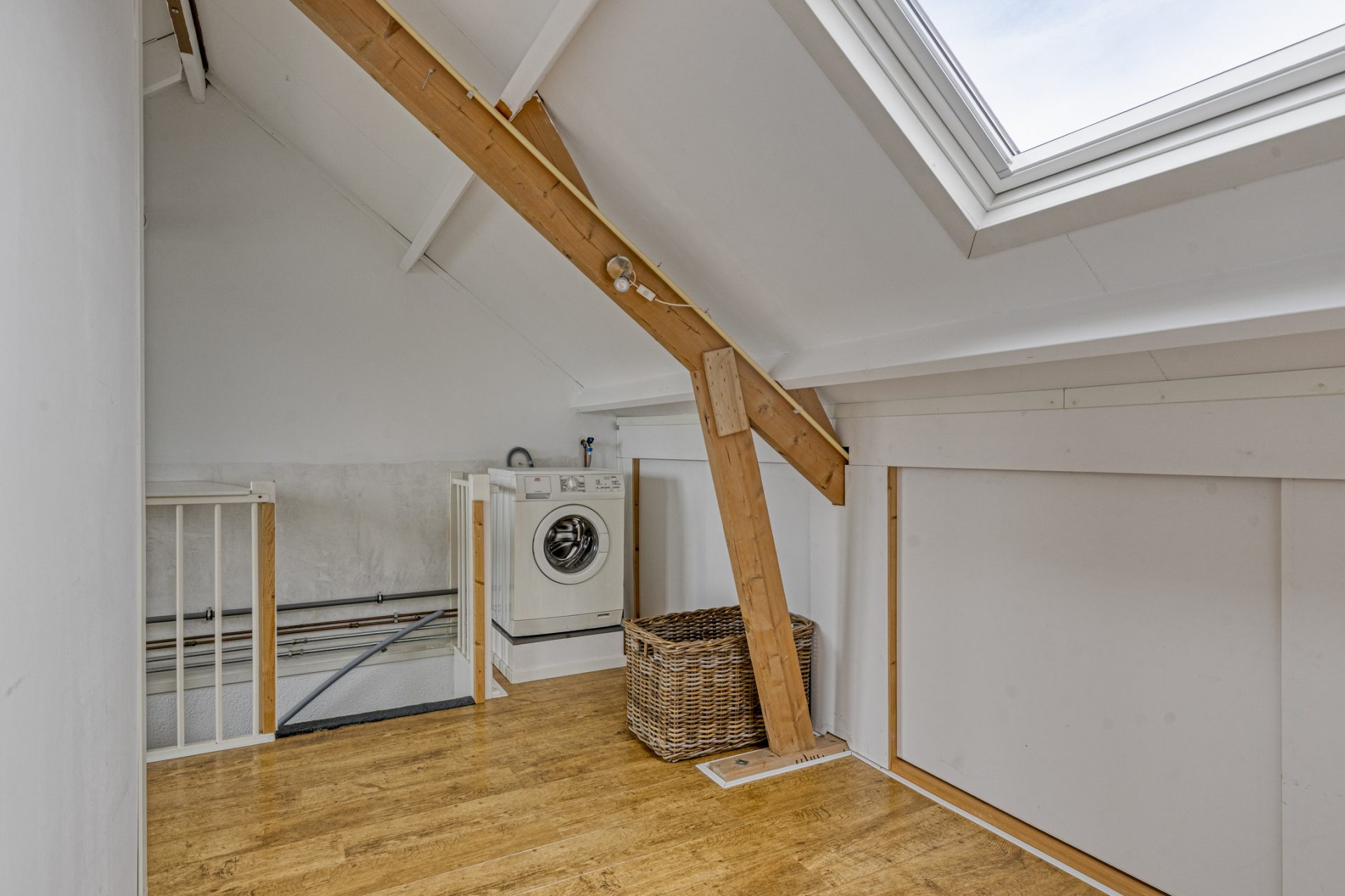 De tweede verdieping biedt plaats aan de vierde slaapkamer van de woning. Daarnaast bevindt zich hier de aansluiting voor de wasmachine en is er voldoende ruimte om de was op te hangen of extra bergruimte te creëren. De kamer biedt bovendien volop bergruimte, fraai weggewerkt achter schuifdeuren, wat zorgt voor een rustige en opgeruimde uitstraling.